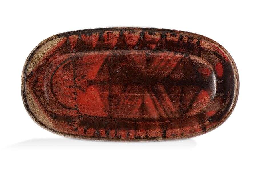 Grand plat ovoïde à décor abstrait sur fond d'émail rouge rosé