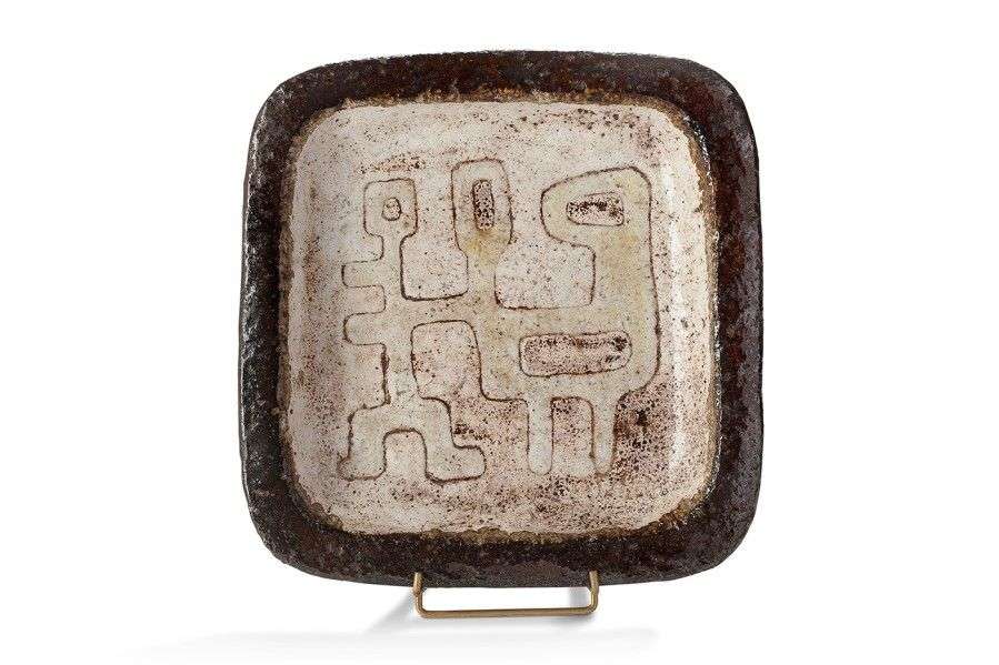 Grande coupe épaisse en terre chamottée de forme carrée à pourtour émaillé marron foncé, à décor central de personnages stylisés émaillé blanc moucheté et jaune vert