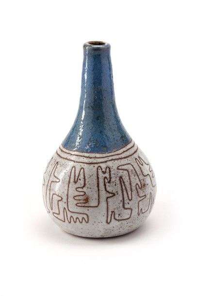 Petit vase gourde à col effilé bleu et décor abstrait scarifié sur fond d'émail gris