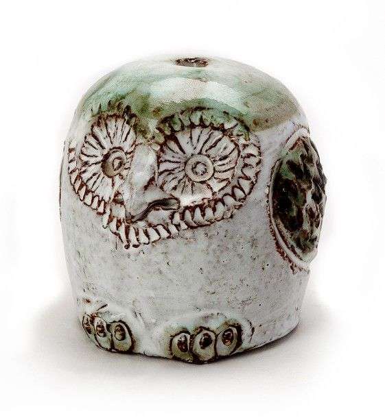 Petite chouette émaillée blanc laiteux et vert d'eau, décor incisé
