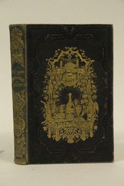 BRILLAT-SAVARIN Physiologie du Goût. Illustrée par Bertall, précédée d'une notice bibliographique par Alph. Karr. Dessins à part du texte, gravés sur acier par Ch. Geoffroy tirés sur chine contre collés, gravures sur bois, intercalées dans le texte, par Midderigh. Paris, Gabriel de Gonet, [1848]| cartonnage bleu-marine d'éditeur in-8, plat orné de deux grandes compositions dorées allégoriques gravées par Haarhaus, dos richement décoré, tranches dorées. Premier tirage des 8 planches, y compris le frontispice et le portrait, protégées par des serpentes de papier de soie. Cartonnage un peu usagé, dos passé et petite fente au mors facilement restaurable, bon exemplaire tout de même pour cette édition célèbre