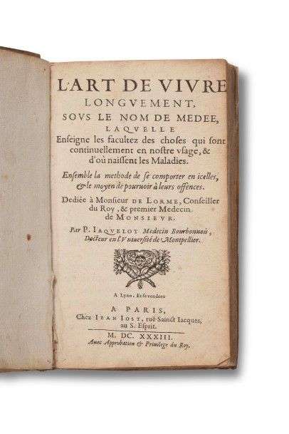[Jacquelot (P.)] Iaquelot / P. L'art de vivre longuement sous le nom de Medee, laquelle enseigne les facultez des choses qui sont continuellement en nostre usage, et d'où naissent les maladies. À Lyon et se vendent à Paris, chez Iean Iost, 1633| in-8, velin d'époque, titre manuscrit en long (reliure de l'époque)| [16], 241 pp. (sign. *, A-P8, Q2). Bel exemplaire| l'édition originale est parue à Lyon en 1630 chez Louis Teste-Fort. Le livre troisième est entièrement consacré au «manger» et à l'alimentation. Bel exemplaire, tout à fait rare