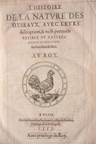 BELON (Pierre) L'Histoire de la nature des oiseaux, avec leurs descriptions, et naïfs portraicts retirez du naturel: escrite en sept livres par Pierre Belon du Mans. Paris, Guillaume Cavellat, 1555| in-folio, demi-maroquin grenat à grain long, dos lisse à faux nerfs dorés, titre doré (rel. fin XVIIIe tout début XIXe)| [28] titre avec portrait de l'auteur au verso, 381 pp., adresse de l'imprimeur au verso de la p. 381: Benoist Prevost, à Paris. Édition originale, entièrement réglé| outre les 159 figures d'oiseaux, ce beau livre est enrichi de belles initiales. «On rencontre des exemplaires au nom de Cavellat», ce qui est le cas ici [...] «le second livre, qui est consacré aux oiseaux de rapine, contient d'intéressants chapitres sur la fauconnerie». Thiebaud-65-66| Souhart-45 Les sept livres ont un titre propre. Bel exemplaire, entièrement réglé
