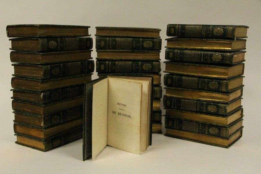 Paris, Rapet, 1819| 30 tomes in-8, maroquin vert empire à grain long, dos lisse décoré d'un grand croisillon central, de fers, palette, filets et titres dorés, roulette d'encadrement, tranches dorées (reliure de l'époque)| Eloge de Buffon par Condorcet| Notice sur la vie de Buffon par Lacépède et en tout 350 planches hors-texte, finement gravées, dont les portraits de Buffon et de Lacépède, 4 cartes dépliantes, 91 pl. de quadrupèdes, 126 d'oiseaux, 22 de quadripèdes ovipares et serpents et 93 de poissons.