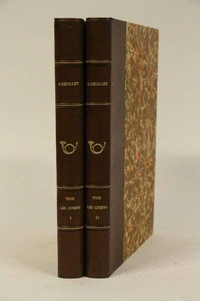 HEUILLET (Hubert) Tous les chiens. Préface de Paul Dechambre. D'après les aquarelles originales d'André Lagarrigue. Toulouse, Les Frères Douladoure, 1934 2 tomes grand in-4°, demi-chagrin lavallière, dos à nerfs, titre et fer à la trompe de chasse dorés, couvertures illustrées d'une vignette en couleurs, conservées (reliure moderne)| 226 planches non numérotées dont 34 en couleurs.` Édition originale, un des 1000 exemplaires numérotés. Parfait état. (Thiebaud-955| Mouchon-1159)