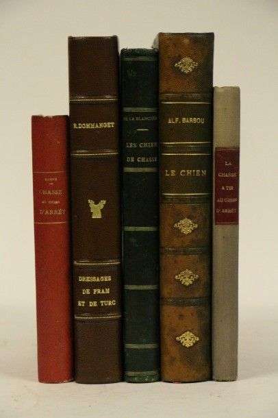 Chiens de Chasse Lot de 5 ouvrages reliés La Blanchère - Les chiens de chasse. Dessins par De Penne. 1875| in-8. La Chasse à tir au chien d'arrêt et la chasse au gibier d'eau Ouvrage collectif. Dommanget - Dressage de Fram et de Turc. Croquis. Lagarrige et La Nezière. 1949| in-8. Barbou - Le chien. Son histoire. Son exploit... 1883| in-8. Chenu - Chasse au chien d'arrêt. Gibier à plume. 1865| in-12, 80 pl. HT