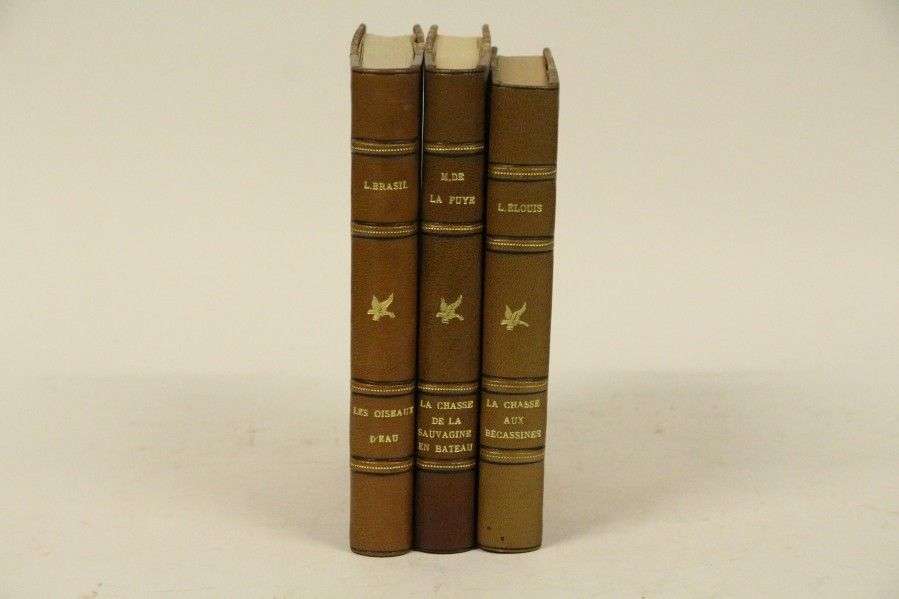 Brasil (Louis)- Les oiseaux d'eau, de rivage et de marais de France, de Belgique et des iles Britanniques. Avec 142 figures. Paris, Baillière, 1914 (Thiébaud-128). Elouis (Léopold) - La chasse aux bécassines. Chasses au marais et au bord de la mer en Normandie. Illustrations de E. Mas. Paris, Vanier, s.d. (1887)| in-12| frontispice et 1 pl. en couleurs, 7 vignettes in texte (Thiébaud-332). La Fuye (Maurice de) - La chasse de la Sauvagine en bateau, précédée d'une préface de Louis Ternier. Illustré de dessins de P. Gabien. (Thiébaud-546). Reliés de façon identique: demi-chagrin bordeaux, titre et fer à l'oiseau dorés, couvertures conservés, bon état général