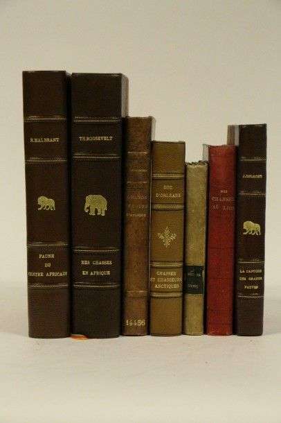 Chassaing - Mes chasses au lion. Préface P. Garnier Dessins Martinus. 2e éd. P. Dentu, 1870| demi-percaline.Delmont (Joseph) - La capture des grands fauves et des pachydermes. P. Plon, 1932| demi-chagrin bordeaux. Gérard (Jules) - La chasse au lion ornée de gravures dessinées par Gustave Doré et d'un portrait de Jules Gérard. P. Librairie Nouvelle, 1855| demi-velin. Gromier (Dr. Emile) - Grands fauves d'Afrique I. Amiot Dumont, 1949| demie-basane. Malbrant (René) - Fauve du Centre Africain Français. 2e éd. Paul Lechevallier, 1952, demi-chagrin marron. Orléans (Duc d') - Chasses et chasseurs Artiques.