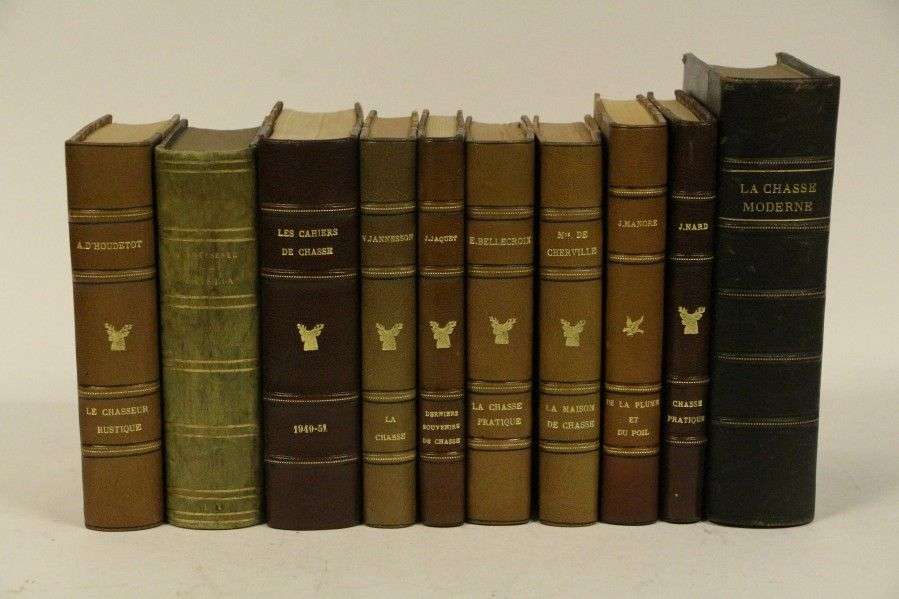 VARIA Lot de 10 ouvrages de chasse reliés Collectif - La chasse moderne. Encyclopédie du chasseur (circa 1910). Nard - Chasse pratique. Brévaire de Nemrod. 1947. Manore - De la plume et du poil. 1904. Cherville - La maison de chasse. 1885. Bellecroix - La chasse pratique. 1884. Jaquet - Dernier souvenir de chasse 1927. Janneson - La chasse 1894. Toussenel - Tristia. Histoire des misères et des fléaux de la chasse. 1863. EO. Houdetot - Le chasseur rustique.1852. Burnand - Les cahiers de la chasse. 1949-1951. Bon état général