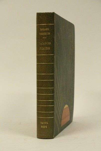 Illustrations de Raoul Dufy. Bois gravés de Jacques Beltrand.Paris, Vialetay, 1956| in-4°, maroquin vert, demi soleil mosaïqué fauve, orange et jaune, jeu de filets dorés formant des rayons en V, certains brisés en haut du plat pour symboliser un lever ou un coucher de soleil sur les deux plats, dos lisse et continuation des filets dorés des plats qui se rejoignent| contreplats de maroquin bleu encadrant une pièce de soie jaune lumineux, gardes de même, couverture blanche conservée, non rogné (Cl. Guerrier)| 24 aquarelles de Raoul Dufy.