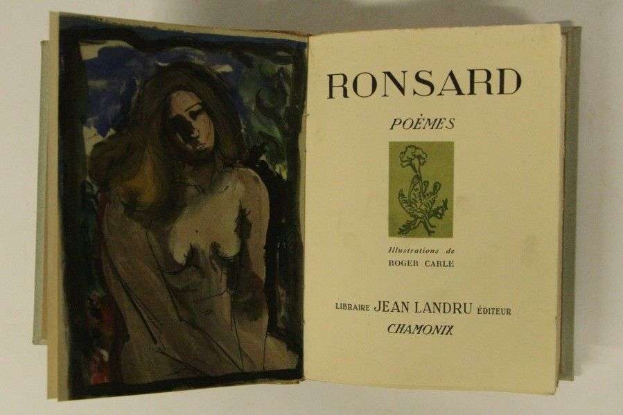 Poèmes illustrations de Roger Carle. Chamonix, Landru, 1943| in-8, broché, couverture illustrée rempliée, planches en couleurs coloriées par Jacomet. Un des 30 exemplaires sur Madagascar, N°20 (955 au total). Chemise, étui absents