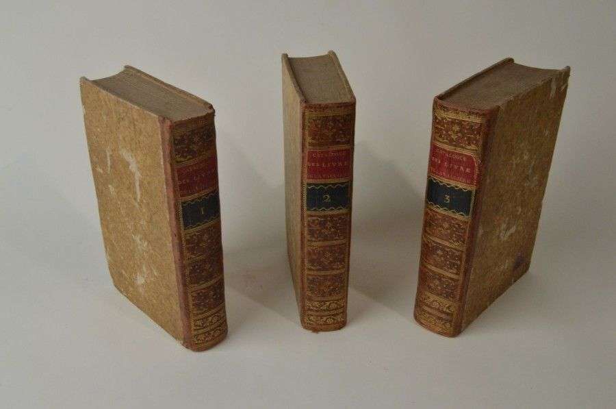 [BIBLIOGRAPHIE] - BURE, Guill.-Franc de. Catalogue des livres provenans de la bibliothèque de M. L. D. D. L. V. (le duc de la Vallière), disposé et mis en ordre... par Guill.-Franc. de Bure, le jeune. Paris: G.-F. de Bure le jeune, 1783| 3 volumes in-8 demi basane. Reliée, avec pagination séparée à la fin du Tome III: Seconde Table des livres sans noms d'auteurs et le Prix imprimé atteint par les ouvrages. (mention 1ère partie). Prix manuscrits à l'encre pour l'ensemble des références. Brulure aux 4 derniers feuillets du Tome III (table des prix), avec petit manque. Bon exemplaire cependant de ce rare catalogue