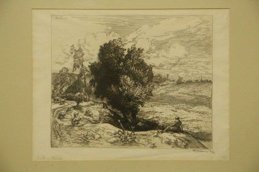Eau-forte originale signée dans la planche en haut à gauche et située “ Crèvecoeur 1909“, contresignée à la main en bas à droite, justifiée 31/ 40. Env. 24 x 29 cm (hors marge). Encadrée. Papier légèrement froissé, bon exemplaire
