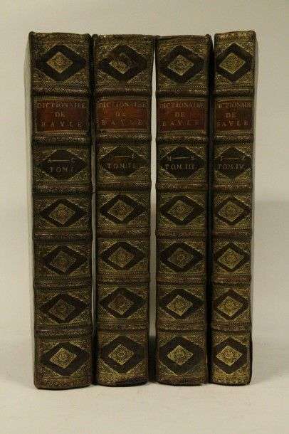 Par M. Pierre Bayle. Troisième édition revue, corrigée et augmentée par l'auteur. Rotterdam, Michel Bohm, 1720| 4 volumes in-folio, plein veau brun granité de l'époque, dos à nerfs très orné de larges fleurons et fers dorés, titre doré sur étiquette vieux rouge, tomaison dorée, roulette dorée sur les nerfs et les coupes. Vignette gravée au titre et en en-tête au Tome 1. Restauration aux mors du Tome 1, gardes renouvelées au tome 1, traces de mouillures au début et fin du tome 3. Bon exemplaire