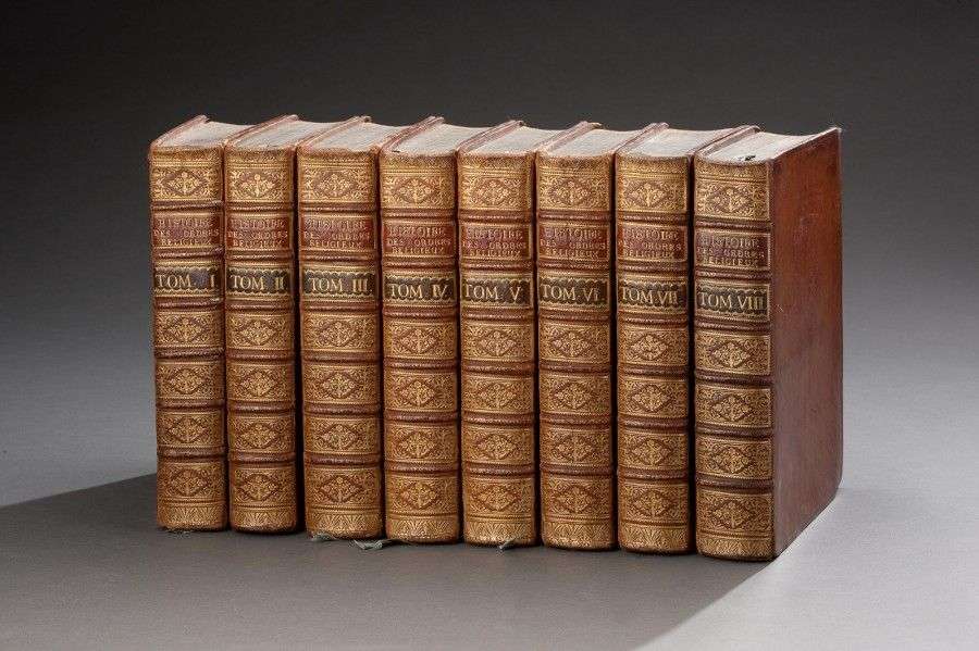 [HISTOIRE - RELIGION] - HELYOT Pierre. Histoire des Ordres monastiques religieux et militaires et des Congrégations séculières de l'un et de l'autre sexe qui ont esté établies jusqu'à présent... leur origine, leur formation... les vies de leurs fondateurs...avec des figures qui représentent tus les différens habillements de ces Ordres et Congrégations. Paris, Nicolas, Gosselin, 1714-1719| 8 volumes in-4, plein veau fauve de l'époque, filet à froid encadrant les plats, dos à nerfs, caissons de filets et filets dentelés dorés, richement ornés de fleurons, petits fers dorés, titre doré sur étiquette de maroquin vieux rouge, tomaison sur étiquette de maroquin olive, tranches jaspées et peignées de bleu, les tranches en tête et queue sont dorées et ciselées aux coins et dans sur 7 cm en partant du dos Édition originale par les PP. Pierre Hélyot et Maximilien Bullot, illustrée de 806 planches gravées. Bel exemplaire très bien relié. Mouillures au Tome 8, angulaires et marginales au T.6, rares piqûres à l'eeeeennnsemble des volumes, des coins légèrement frottés