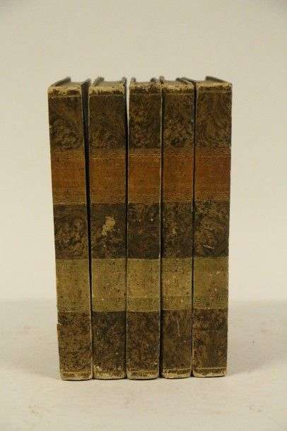Paris, Migneret, 1802| 5 volumes in-8, cartonnage marbré de l'époque, pièce de titre et de tomaison ocre et olive. Le tome 5 porte: «Appendice du génie du christianisme». Ex-libris manuscrit au 1er contre-plat “ Edouard Teuffel“. Bon exemplaire de l'édition originale. Coiffes et coins frottés, quelques rousseurs