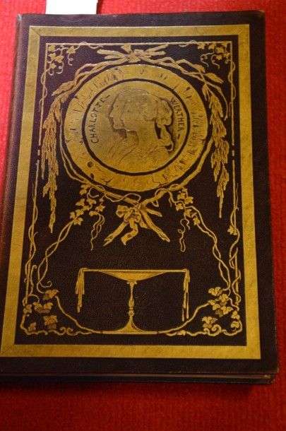 [LITTERATURE] - GOETHE. Werther traduction nouvelle, précédée de considérations sur Werther et en général sur la poésie de notre époque, par Pierre Leroux accompagnée d'une préface par George Sand| dix eaux-fortes par Tony Johannot. Paris, Hetzel, 1845| grand in-8, plein cartonnage violine de l'éditeur, important décor doré sur les 2 plats “Charlotte et Werther“, dos orné, titre doré tranches dorées.Rares piqûres, dos légèrement passé. Bel exemplaire