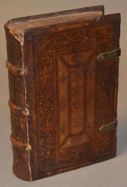 Commentarius de praecipuis divinationum generibus. Witterbergae, 1553. 1 vol. in-12. Veau ancien, dos à nerfs orné, plat décoré de motifs à froid, fermoirs. Mors fendus, manque à la coiffe supérieure, restauration. Petit manque avec perte d'un mot à la page de titre. Mouillures aux premiers feuillets