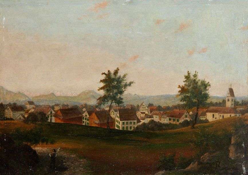 Village avec deux arbres et un clocher sur un horizon de montagnes