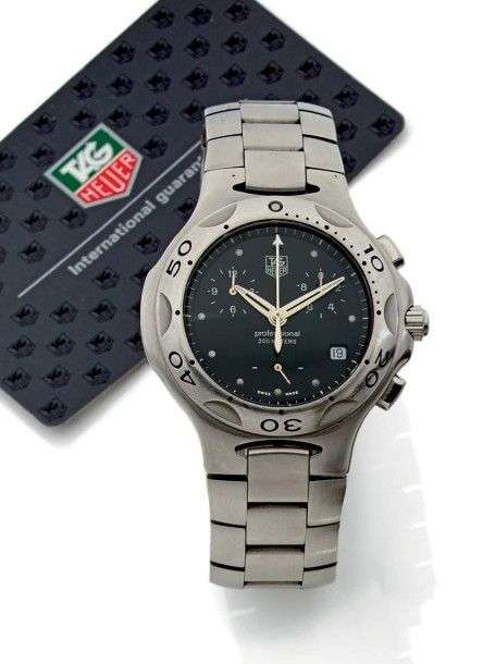 TAG-HEUER Professional 200 m Vers 2000. Chronographe pour homme en acier Cadran noir, 3 compteurs, date à 4h. aiguilles acier luminescentes. Mouvement à quartz. Lunette tournante, graduée 60 mn. Ne fonctionne pas, pile ? Diam 39 mm. Carte de garantie d'origine, vendue le 23/08/02