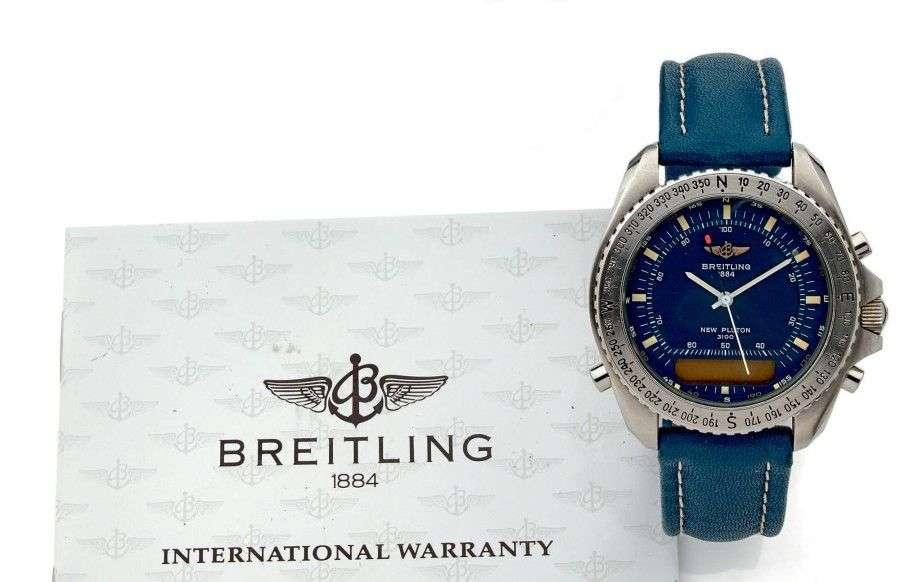 BREITLING New Pluton Vendu le 7/08/93. Modèle d'aviation en acier. Cadran bleu, index et aiguilles bâtons, affichage mixte: Analogique et digital par écran cristaux liquides. Lunette tournante graduation boussole. Mouvement quartz. Bracelet cuir bleu, boucle ardillon siglée. Acier. Ecrin d'origine et documents. Diam 41mm. Ne fonctionne pas, pile ?