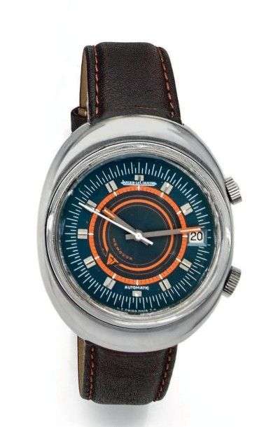 JAEGER LECOULTRE Mémovox Vers 1970. Speed Beat GT. Ref E873. Modèle homme automatique, forme ovale, acier. Disque de réglage d'index de sonnerie au centre. Cadran bleu, minuterie orange, index appliques, aiguilles bâton, dateur à 3H. Mouvement cal 916 freq 28800 alt/h. Boitier 2 corps, fond vissé. Fonctionne. Bon état Dim 38x45 mm. N°1275966