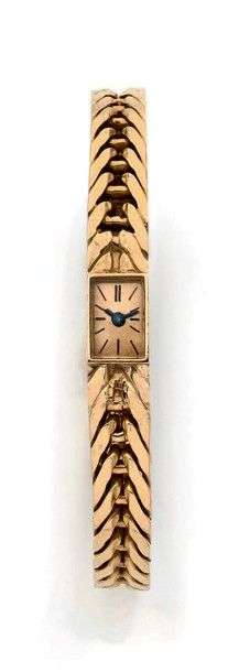 Modèle de dame, bracelet rigide en or 18K. Cadran champagne, index et aiguilles bâtons. Mouvement baguette, freq 18000 alt/h. Boitier 2 corps, remontoir en dessous. Bracelet rigide façon tresse. Ne fonctionne pas, révision à prévoir. Poids brut 49,7 gr. Dim 7,5x24 mm