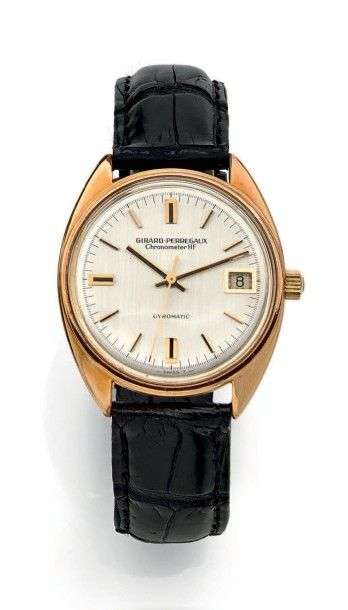 GIRARD PERREGAUX Chronometer Vers 1960. Haute Fréquence, Gyromatic, 39 rubis. Modèle homme en plaqué or. Date à 3h. Cadran argenté, Index appliques et aiguilles bâtons. Mouvement automatique cal 32A762. Freq 36000 alt/h. Boitier 2 corps, fond acier vissé. Fonctionne, très bon état. Dim 35mm