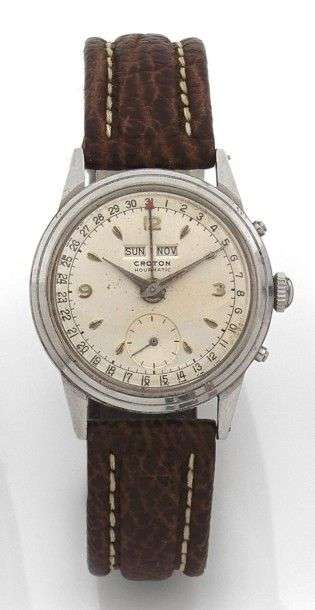 CROTON Hourmatic Vers 1950 Modèle homme acier triple quantième. Cadran argenté, chiffres arabe mixtes, aiguilles dauphines. Guichets pour le jour et la date. Boitier 2 corps en acier. Fond étanche. Mouvement automatique. Freq 18000 Alt/h. Systèmes à butées. Diam 33 mm. Fonctionne