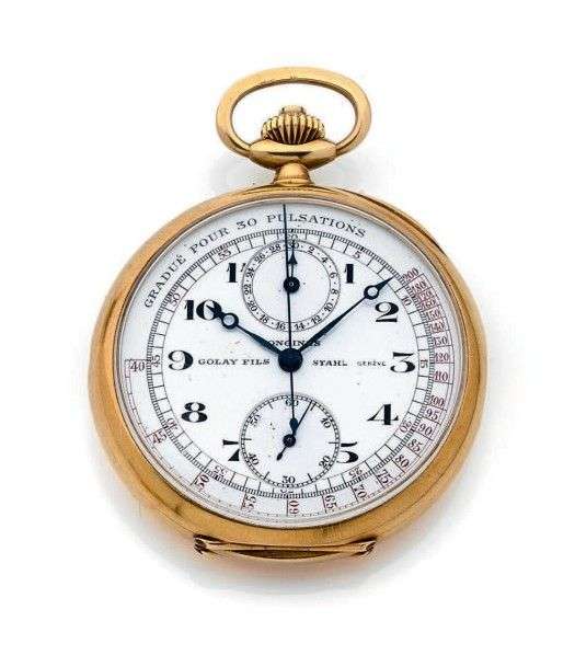 LONGINES Pulsomètre Vers 1900 Pour GOLAY Fils Montre gousset chronographe en or 18K à l'usage des docteurs. Cadran en émail, chiffres arabes, aiguilles Breguet acier bleui. Mouvement 16 lignes. Freq 18000 alt/h. Echappement à ancre, balancier bimétallique, spiral Breguet. Compteur totalisateur 30 mn à 12h, secondes à 6h. Boitier 4 corps à charnières. Remontoir et poussoir coaxial. Echelle graduée pour 30 pulsations. Fonctionne. Changement des huiles conseillé. Poids brut 74,5 gr. Diam 48 mm
