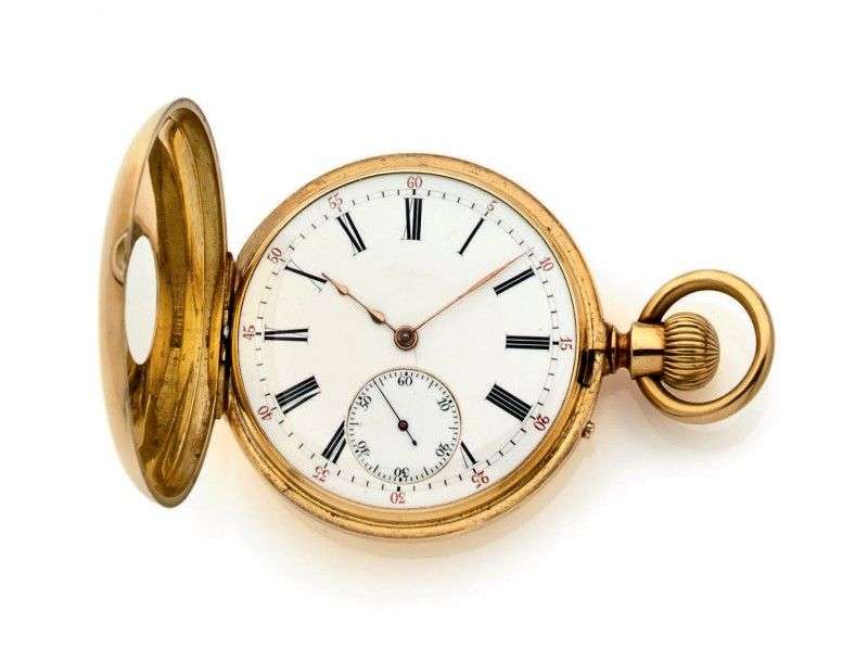 BREGUET Vers 1876 Montre de poche savonnette en or 18K. Cadran émail, chiffres Romains, minuterie rouge. aiguilles de style. Mouvement 18 lignes, échappement à ancre, balancier bimétallique, spiral Breguet. Freq 18000 alt/h. Petite trotteuse à 3h. Boitier 5 corps, couvercle gravé chiffres romains. Fonctionne. Bon état. Archives Breguet: Vendue le 20 dec 1876 à Mr Eugène de Reims pour la somme de 800 F. Etui rouge non d'origine. Poids brut 86,9 gr. Diam 47 mm