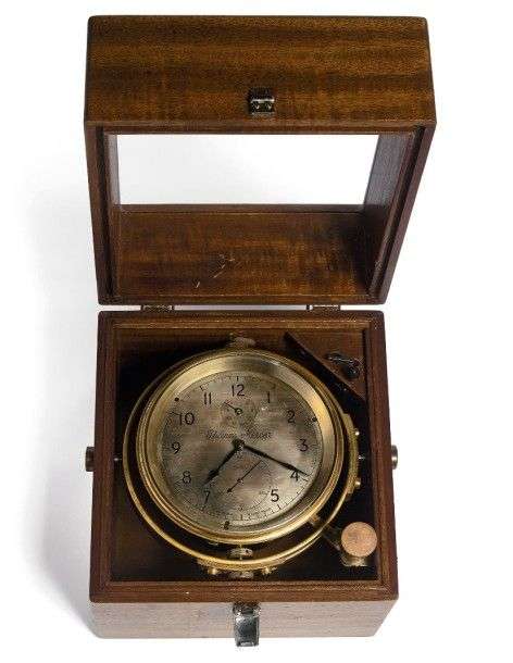 THOMAS MERCER Vers 1880 N°26783 Chronomètre de marine 2 jours. Cadran argenté, chiffres arabes, aiguilles feuilles en acier bleui. Indication de la réserve de marche à 12h. Compteur de secondes à 6h. Mouvement en laiton, dispositif de régulation de couple chaine, fusée. Echappement à détente ressort, spiral cylindrique. Boite 2 corps en bois Mahogany, système de cardan et suspension à lames. Diam du cadran 128 mm. Dim. 21x21x21 cm Fonctionne, bon état