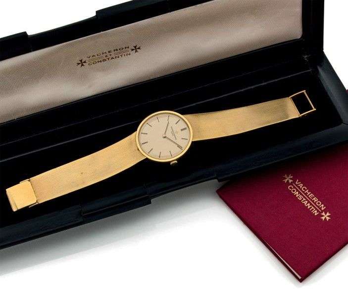 VACHERON & CONSTANTIN Vers 1960 Ref 7811. N°456121 Modèle homme, tour de bras tout or jaune 18K. Cadran champagne, aiguilles et index bâtons. Boitier 2 corps, bracelet tout or. Mouvement K 1014 N°637193. Freq 18000 alt/h. Ecrin et documents d'origines. Fonctionne, bon état. Maillon joint en or, vestige de mise à taille. Poids brut 84,60 gr. L 18,5 cm. Diam 33 mm