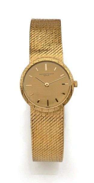 VACHERON CONSTANTIN Vers 1960 Ref 6898. N°427710 Modèle dame, tour de bras tout or jaune18K. Cadran champagne, index et aiguilles bâtons. Mouvement cal 1003, freq 18000 alt/h. Boitier deux corps. Bracelet tresses or solidaire. Poids brut 48 gr. Diam 24mm. Etui de voyage cuir noir. Fonctionne, bon état