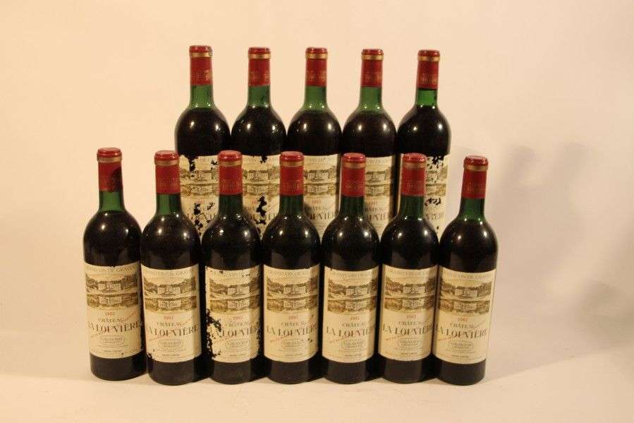 12 B B CHÂTEAU LA LOUVIERE Rouge (1 B.G| 4 T.L.B| 5 H.E.+| 2 H.E| 7 e.l.a| 1 e.a| 4 e.t.a. avec 2 millésimes partiellement lisibles.)