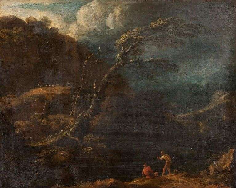 Deux pêcheurs au bord d'un torrent sous un ciel d'orage
