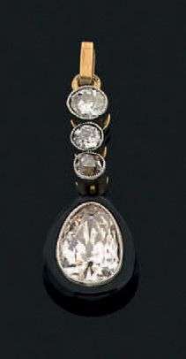 Pendentif en or jaune et gris 18k composé d'une chute de petits diamants retenant un diamant de taille ancienne de forme poire dans un entourage émaillé noir.