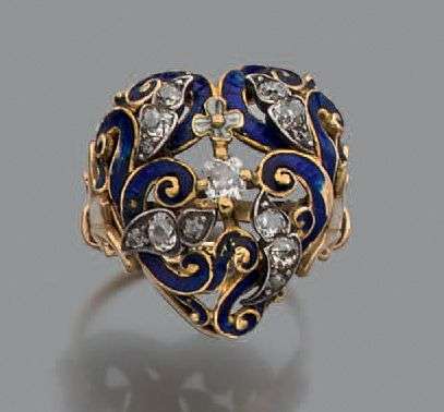 Bague en or jaune 14k et argent composée d'un ensemble de volutes émaillées rehaussées de diamants formant un coeur . Epoque XIXème