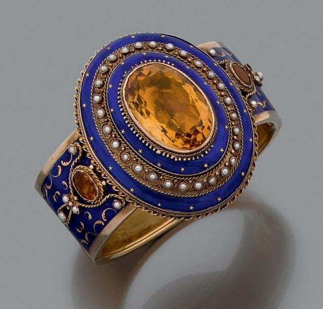 Important bracelet jonc en or jaune 18k et argent rehaussé d'émail bleu étoilé, de torsades en or et de petites perles, au centre une importante citrine. Epoque Napoléon III
