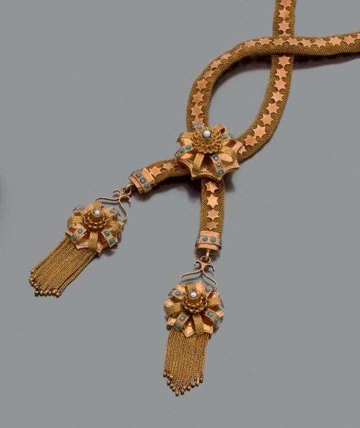 Collier en or jaune tressé 18k appliqué d'étoiles et rehaussé au centre d'un motif ciselé et émaillé retenant en breloque deux motifs assortis.
