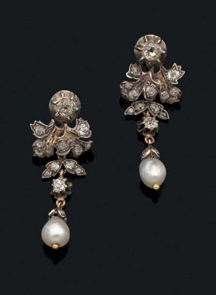 A yellow gold and silver pair of earrings, foliage-shaped, set with ancient-cut diamonds and a baroque pearl.
