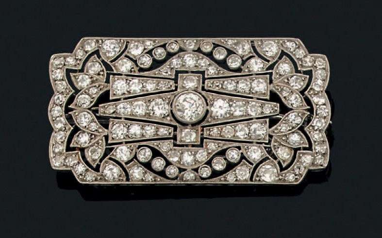 Broche "plaque" en platine ajouré sertie de diamants taille ancienne. Vers 1920.