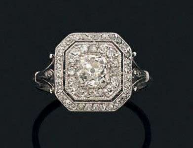 A platinum and white gold ring set with an ancient-cut diamond within a frame of diamonds