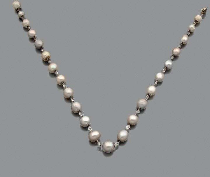 Collier composé de 22 perles fines en chute alternées de petits diamants de taille ancienne. Pb: 41.96gr. Accompagné d'un certificat du laboratoire de gemmologie N° 317912 attestant perles fines, eau de mer.Dim: 7.5 - 12.3 mm env