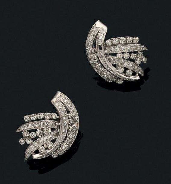 Paire de clips d'oreilles en platine et or gris 18k sertis de diamants hui