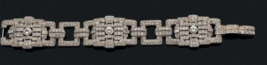 Bracelet articulé en platine et or gris 18k composé de trois motifs rectangulaires ajourés sertis de diamants taille huit-huit, au centre une pierre blanche plus importante. Vers 1930