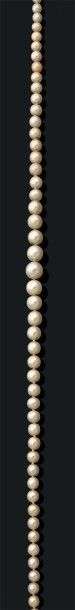 Collier composé de 57 perles fines et 4 perles de culture en chute.