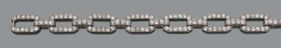 Bracelet articulé en platine composé de maillons rectangulaires sertis d'une ligne de diamants de taille brillant. Vers 1930