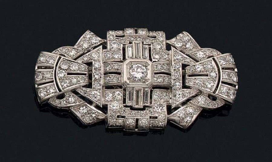 Broche "plaque" à décor géométrique en platine et or gris 18k sertie de diamants de taille brillant et baguette. Vers 1940
