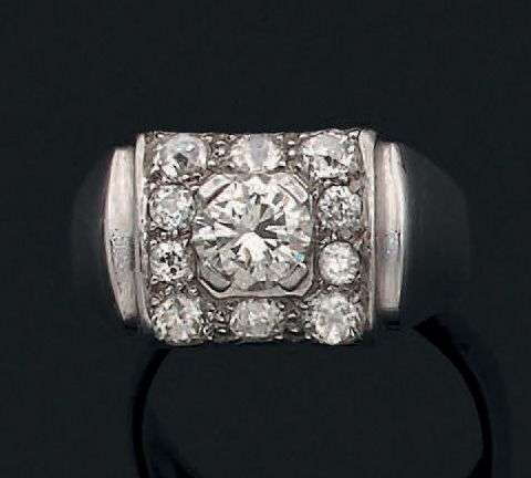 Bague chevalière en platine et or gris 18k sertie d'un diamant taille brillant dans un entourage rectangulaire légèrement bombé serti de diamants de taille ancienne.